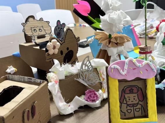 这场“巧手再生,环保工坊”学雷锋活动,采用的是“环保+设计”模式。他们结合所学的雷锋故事和对雷锋精神的理解,就地取材,把纸箱、瓶盖这些生活废弃物变成了一个个视觉作品。从裁剪纸箱做收纳盒,到拼接瓶盖制摆件,再到用彩纸、黏土精修细节,同学们将“艺术审美”融入“变废为宝”的创作之中,最终亮相的纸箱改造收纳盒、瓶盖拼接小推车、纸艺花艺手绘品等等,每一件都是专业巧思与环保初心的双重结晶。