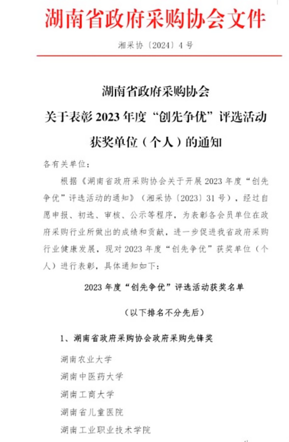 政府采购先锋奖由湖南省政府采购协会在会员单位中的采购人单位中评选。需当年在政府采购行业中做出较大贡献和优良成绩,践行社会责任,敢于担当,在行业内起到引领示范作用的采购人单位。2023年,我校积极贯彻落实国家、省、市各级各项制度文件要求,不断健全完善采购制度,强化制约监督,不断加强政府采购制度创新,切实提高政府采购服务水平,同时,我校积极探索非政府采购项目“双盲”投标、“双盲”评标采购模式并取得良好效果。