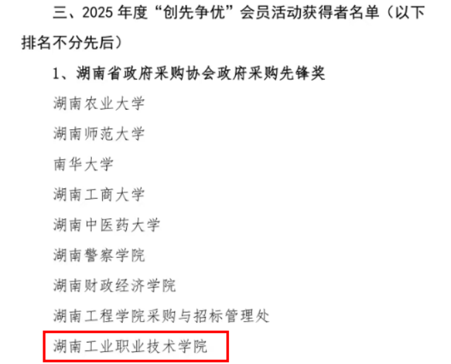 近日,湖南省政府采购协会2025年度会员大会在长沙隆重举行。经过严格评审与激烈角逐,我校凭借在政府采购领域的持续卓越表现和突出贡献,再次荣获年度“政府采购先锋奖”。该奖项是湖南省政府采购协会设立的年度重要荣誉,旨在表彰在政府采购工作中表现突出、具有示范引领作用的单位和个人,评审涵盖采购规范性、创新性、社会效益等多个维度,在业内具有广泛影响力和权威性。