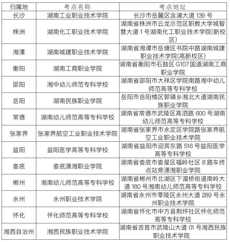 根据湖南省考试院《关于印发〈2022年湖南省高职(高专)单招考试分市州实施组考有关工作的指导意见〉的通知》(湘教考普字〔2022〕2号)文件规定,以湖南省考试院提供的考生号为依据,考生在所归属的市州考点参加考试(体育艺术特长生除外,体育艺术特长生均需到长沙市参考)。考生归属市州可根据考生号判断,各市州代码为两位,如考生号是14位,则市州代码为自左边数起第5位和第6位;如考生号是10位,则市州代码为自左边数起第1位和第2位。各市州代码如下:长沙01;株洲02;湘潭03;衡阳04;邵阳05;岳阳06;常德07;张家界08;益阳23;娄底25;郴州28;永州29;怀化30;湘西自治州31。各市州考点安排情况见下表:
