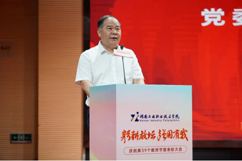学校党委书记刘建湘讲话,他指出,教师是立教之本、兴教之源,学校紧跟时代需求推动师资队伍建设,从党建引领全面加强师德师风建设,引育并举不断优化教师队伍结构,科教融汇强化教师队伍能力提升三个方面介绍了学校教师队伍建设改革工作取得突出成效,并从落实立德树人根本任务,提高思政工作本领,树立良好师德师风,塑造教师美好形象,积极探索新时代教育教学方法,不断提升教书育人能力,注重言传身教,引导青年成才等方面做了相关要求。