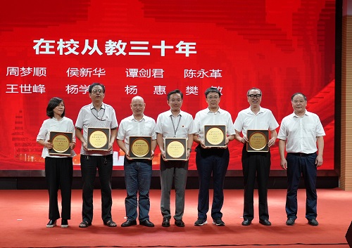 “我志愿成为一名人民教师,忠诚党的教育事业,遵守教育法律法规……”现场,新入职教师集体宣誓,誓言铿锵有力。大会现场,学校党委书记刘建湘,为学校教师代表颁发在校从教30年纪念奖章。