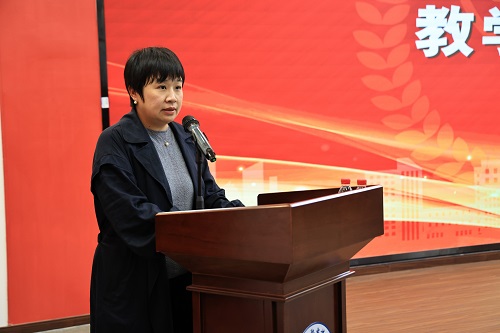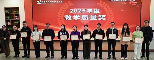 在表彰环节,成涛宣读2024—2025学年教学质量奖获奖教师、优秀教研室表彰决定,刘苗等34位教师被授予2025年度学校教学质量奖荣誉称号,机械装备制造技术等12个教研室被评为2024-2025学年优秀教研室。在典型经验交流环节,机械工程学院刘苗、创新创业学院尚晓丽、信息工程学院邓丽君、商务贸易学院王晋四名教师结合自身体会,分别从课程建设、专创融合、教学管理、专业建设等方面娓娓讲述了自己深耕教学一线的奋斗故事。