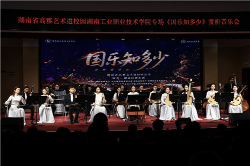 本网讯 4月21日晚,由湖南省教育厅、中共湖南省委宣传部、湖南省财政厅、湖南省文化和旅游厅主办,我校和湖南省歌舞剧院承办的“高雅艺术进校园——《国乐知多少》赏析音乐会”暨“楚怡润心系列文化讲坛”在我校大学生活动中心1102精彩上演。湖南民族乐团以精湛的演奏技艺奏响国乐华章,为全校师生呈现了一场兼具专业性与趣味性的文化盛宴。